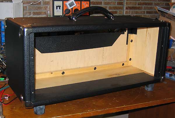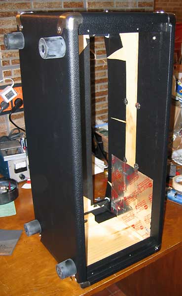 El mueble es bastante grande 63cm de largo por 26cm de ancho por 30cm de alto. Está hecho en madera de pino sólida y machihembrada, muy robusto y rígido y bien terminado, con un excelente Tolex de recubrimiento y con tornillos de acero inoxidable y cantoneras cromadas. Está sobredimensionado quizá para utilizar el mismo mueble para la versión con Reverb.