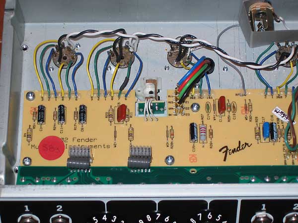 Aquí podéis ver, justo encima de la cinta de cables, el optoacoplador del trémolo.