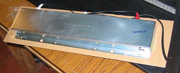Se trata de un tanque Accutronics del tipo "4AB3C1B" que quiere decir que es un tanque largo de 17", de 4 muelles con 8 ohmios de impedancia de entrada (0.81 Ohmios DC), 2250 ohmios de salida (200 ohmios DC), con tiempo largo de "decay" de reverb (de 2.75sg a 4 sg), sin bloqueo, de montaje horizontal con la abertura hacia abajo y típico de amplificadores Fender.