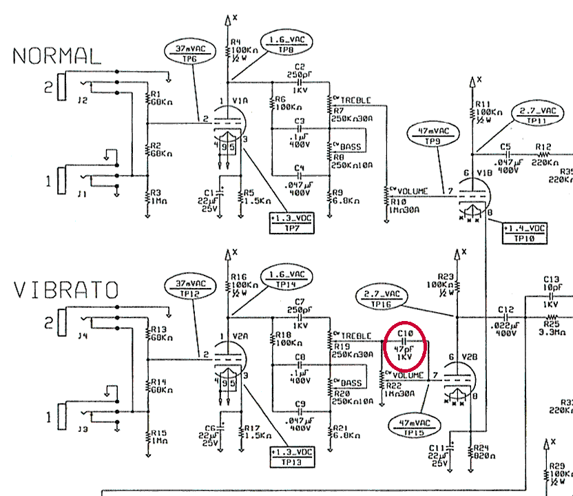 en paralelo como "treble bleed" y el canal normal no. Como estaba claro que el canal normal suena mejor con este altavoz pero queremos poder usar la reverb y el trémolo, al final tuve que quitar ese condensador para equipararlos en timbre: