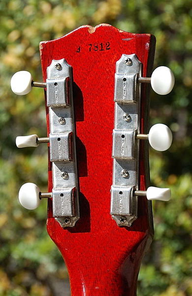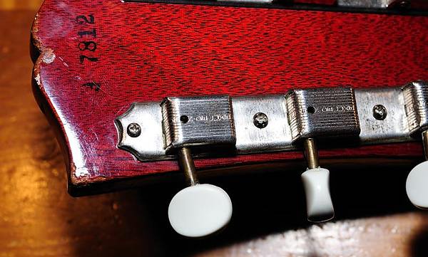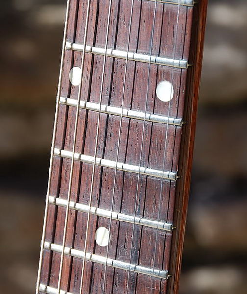 El mástil es de una pieza de caoba (con "aletas" en la pala, claro) y con diapasón de palorrosa de Brasil. Gibson empezó a usar palorrosa indio en el 66. El perfil es bastante grueso y comodísimo... realmente perfecto al tacto. Los trastes, originales, están en un estado tan bueno que hace pensar que esta guitarra ha sido usada bastante poco. El tiro es el habitual Gibson de 24 3/4.