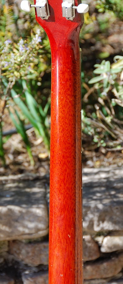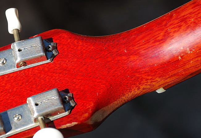 Como podéis ver en estas dos fotos el cuerpo de la guitarra, aunque con signos de sus 50 años bien cumplidos, está en muy buen estado de conservación. Se trata de un cuerpo de caoba sudamericana de dos piezas, muy ligera y resonante cubierto por un acabado de nitrocelulosa que se conserva estupendamente, con algunas rayas de craquelado propias de su edad. El emparejado de las dos partes, justo por la mitad, es buenísimo y hay que fijarse bastante para apreciarlo. El sonido acústico es fantástico lo que redunda en un mejor sonido eléctrico.