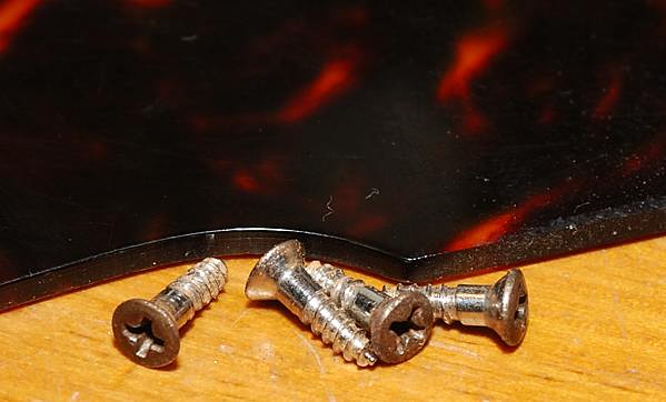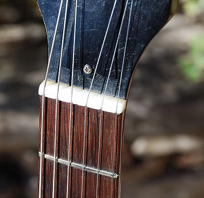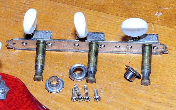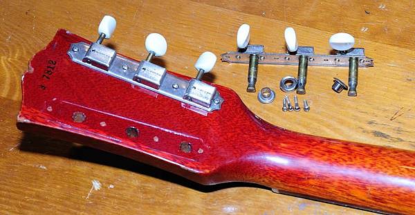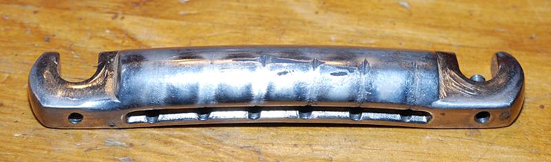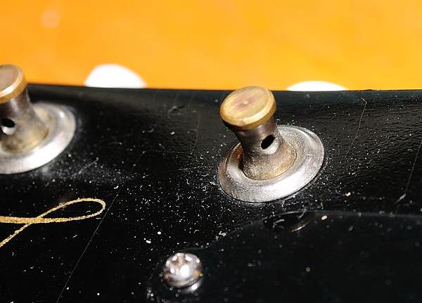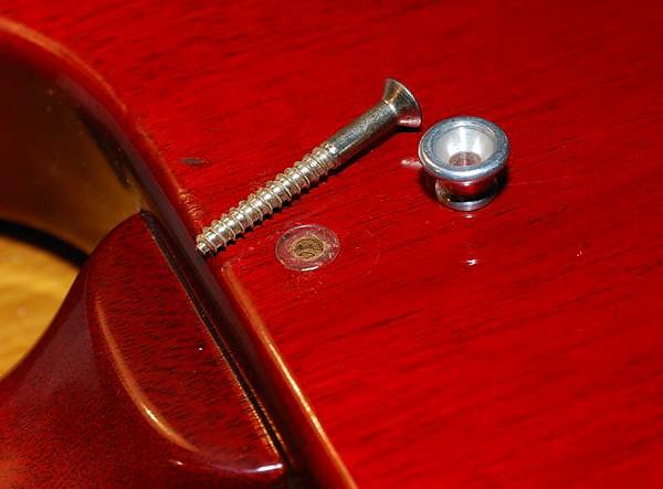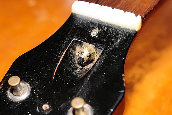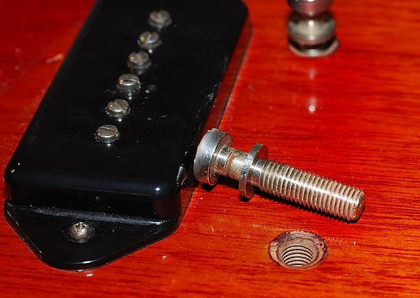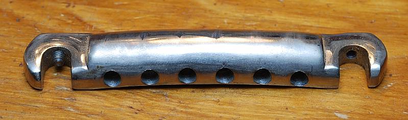 Como es propio de la época y modelo se trata de un Stopbar de aluminio, muy ligero y sin resaltes de compensación de cuerdas. Si os fijáis bien en las fotos veréis que falta uno de los tornillos de ajuste (1/16"), en concreto el de los bordones por lo que el quintaje en esa zona quedaba bastante comprometido. Para solucionarlo compré un tornillo análogo en Guitar Parts. No es un repuesto idéntico pero funciona perfectamente. Para evitar el que se viese el no original, lo puse en la zona de los tiples, quedando así escondido dentro del puente dejando el original en la zona de los bordones bien a la vista y así se se pudo quintar la guitarra de un modo bastante aceptable.