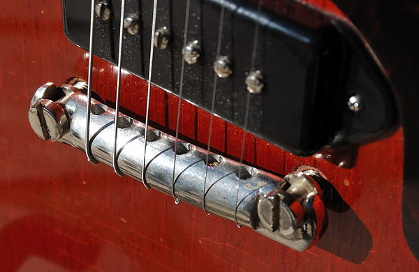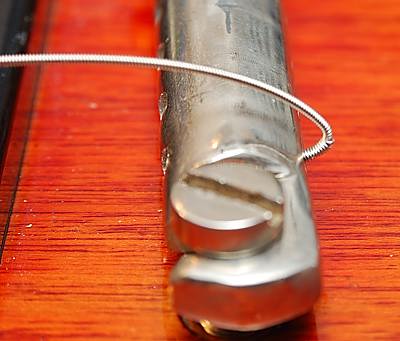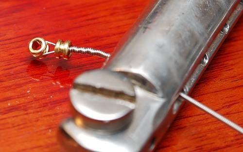 Como curiosidad, este tipo de puente a veces hace que las cuerdas, al girar por encima de ellos (wraparound) dejen los finales enrollados por encima del propio puente haciendo que arañen la mano al hacer palm muting, etc. lo que es bastante molesto. Las cuerdas D'addario que puse parecen ser peores en este aspecto que las que llevaba en origen. Para evitarlo hice el viejo truco de suplementar las "bolas" con otras viejas: