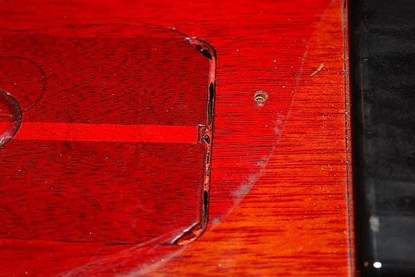 El tenon es bastante largo y, al contrario que con las no DC, no tiene ningún fresado aprovechando el que no lleva pastilla de mástil lo que hace que el conjunto sea más robusto. Su longitud total es de 68mm que es lo máximo permitido para quedar oculto por el golpeador. En las fotos se aprecia claramente que hay un par de marcas circulares que probablemente son fruto de la mordaza utilizada en el proceso de montaje para encolar el mástil al cuerpo. Se ve que como esa parte iba a quedar tapada por el golpeador no se molestaron en cubrirla con algo para que no quedase rastro, cosa que sí tuvieron que hacer por la parte de atrás del cuerpo.