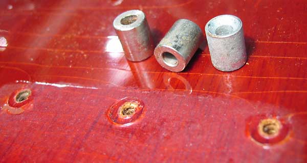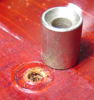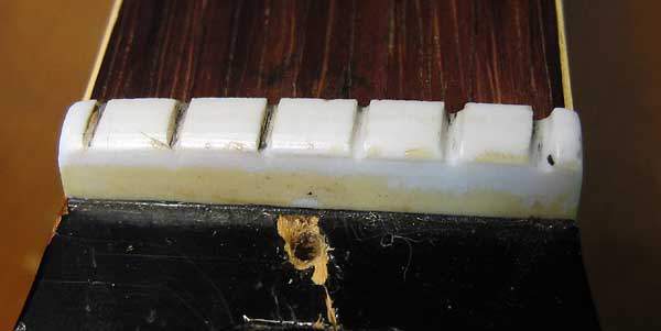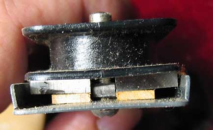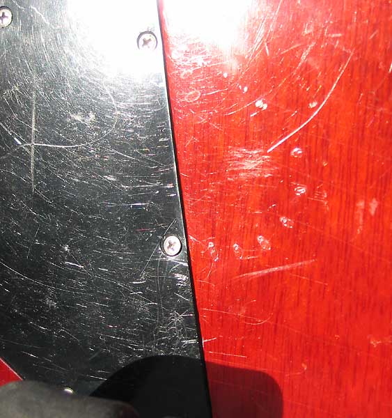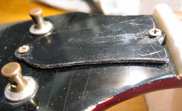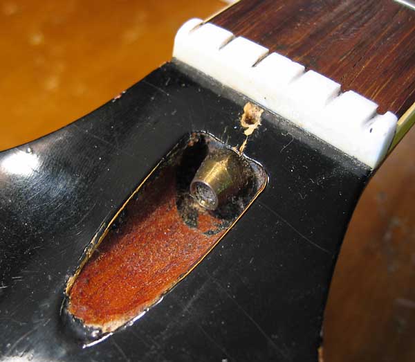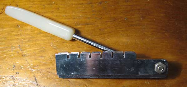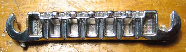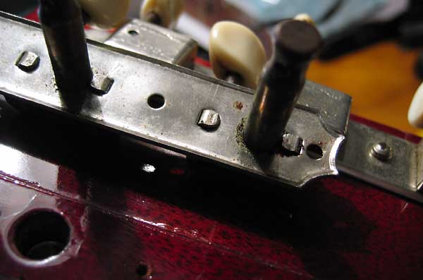 Detalle de la Vibrola corta en la que se aprecia un fallo típico de encordado con estos puentes. Si se hace sin cuidado es fácil desplazar lateralmente el puente del fulcro por lo que quedan las cuerdas mal alineadas con el puente-cordal y provoca que estas salten de las ranuras del cordal hacendo que queden desplazadas con las piezas polares de las pastillas. Aquí se ve cómo estaba desplazado hacia la izquierda, forzando el deslizamiento lateral y por consiguiente desafinando más de lo debido. Hay que tener cuidado con este tipo de puentes: