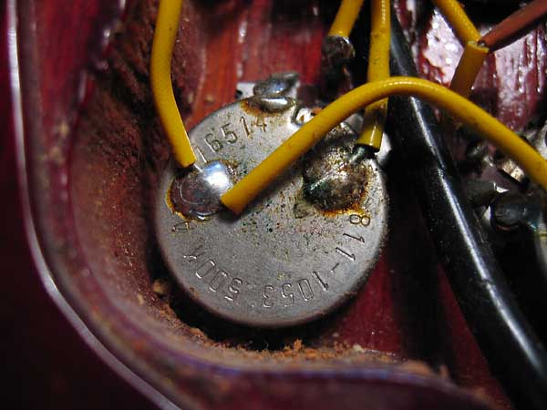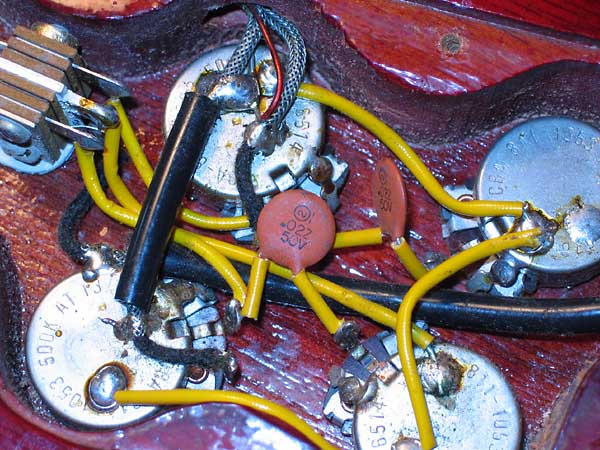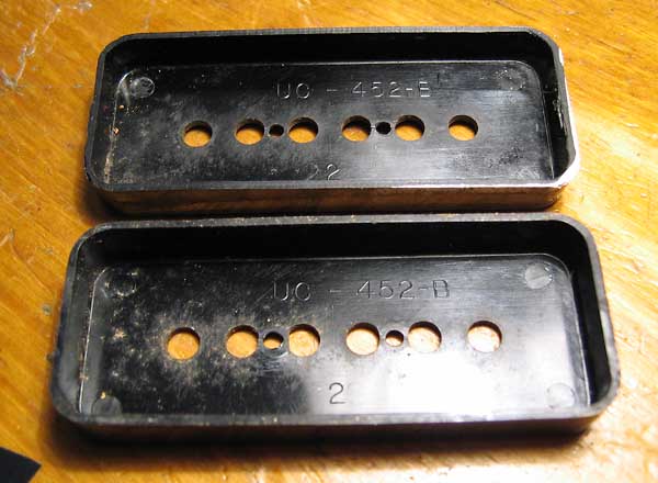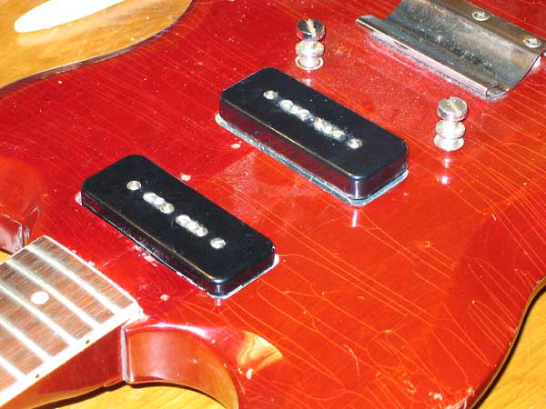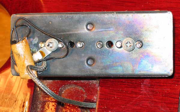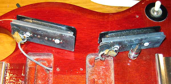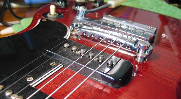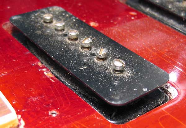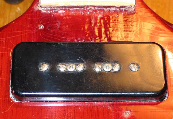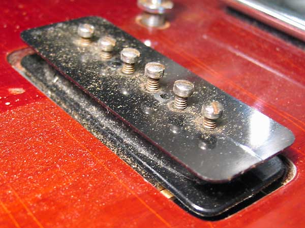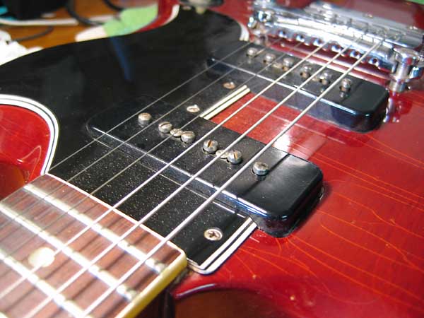 Esta guitarra lleva dos pastillas Gibson P-90 en formato "Soapbar" con cubiertas de plástico negras. Tal y como me llegó la guitarra tenía un sonido muy estridente y bastante feo debido a la forma en la que habían ajustado los tornillos de las piezas polares. Estas pastillas no llevaban muelles o gomas que "tiren" de ellas hacia arriba para ajustar la altura y debido al ángulo del mástil con respecto al cuerpo (4º) y a que la "tapa" no es arqueada quedan demasiado bajas con respecto a las cuerdas. El anterior dueño lo "solucionó" a base de subir exageradamente las piezas polares provocando este problema. Más adelante veremos la solución a esto.