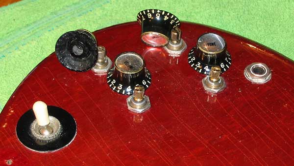 Estos botones se conocen como los "Reflector". Se usaron desde la mitad de año 1960 a mediados de los '70 y son similares a los "Bonnet" solo que con una plaquita metálica en la parte superior rotulada con "Volume" o "Tone" en dorado o plateado según fuese el resto del hardware de la guitarra. Se diferencian también de los primeros "Bonnet" en que tienen el agujero para el poste más profundo que los que se usaron desde mediados de 1960 hasta finales del '61.