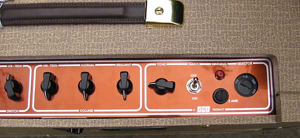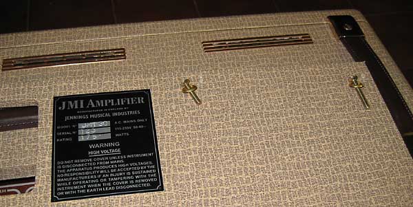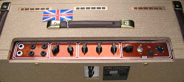 El panel principal es del modelo normal, sin "Top Boost". Siempre se ha considerado el modelo "Top Boost" como el más deseable por tener más ganancia y un control de tonos más versátil: Graves, Agudos y un control de recorte (Cut) común. Cuando originalmente salió al mercado, los propietarios de los modelos VOX AC-30 normales enseguida instalaron un control "Top Boost" en sus amplificadores, quedando del modo que emula este JMI: un pequeño panel con el control de Graves y Agudos en la parte trasera del amplificador y que ya hemos visto más arriba.