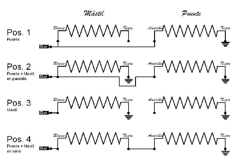 Aquí tenéis un esquema de las cuatro posiciones del conmutador siguiendo la numeración estandar de Fender en que la posición nº1 es la que selecciona la pastilla del puente: