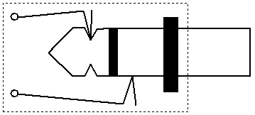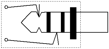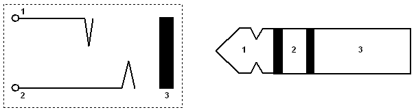 La "caja" de la izquierda representa esquemáticamente a un jack hembra stereo teniendo a su derecha la representación de un jack macho del mismo tipo. La convención estandarizada indica que la toma 1 o "punta" es el canal izquierdo en un sistema stereo, la toma 2 o "anillo" es el canal derecho y la toma tres o "carcasa" es la masa común. Si introducimos el jack macho en el hembra vemos cómo se corrresponden: