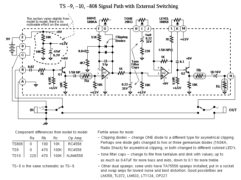 De hecho, los electrolíticos tampoco son muy buenos para audio, lo que pasa es que no hay más remedio que usarlos cuando se necesitan grandes capacidades, si no se quiere usar componentes enormes. De hecho, fijaros por ejemplo en el esquema del TubeScreamer en el que hay un par de condensadores en el esquema que están etiquetados como "1/50 NP". Esto significa que son de 1 MicroFaradio (1uF), 50 Voltios y No Polarizado. El rango de "Microfaradios" es típico de electrolíticos y apuesto que si váis a una tienda de componentes y pedís: "Un condensador de 1uF", os darán un electrolítico con toda seguridad. Pues bién, el sitio donde está puesto el condensador es lo bastante crítico como para que se opte por uno "No Polarizado" de poliéster, que "sonará" mejor. Además, un condensador de Polyester de 1uF tampoco es tan grande. Fijaros en el esquema electrónico del TS, uno está justo a la derecha del primer transistor Q1 y el otro debajo del pote de "Level".