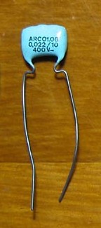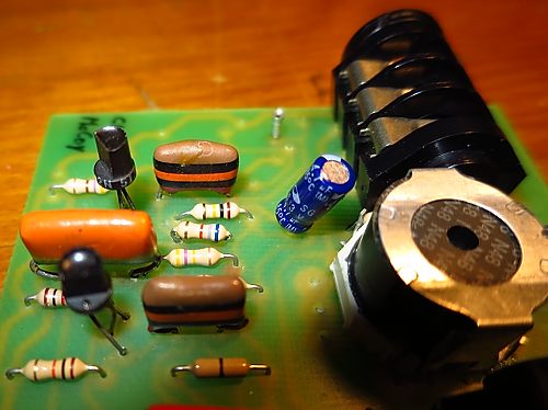 Los condensadores tienen bastante importancia en el "tono" final del wah. En la foto podéis ver que he puesto condensadores de diferente tipo a los originales. Debéis evitar los pequeños condensadores cerámicos y sustituirlos por otros de film según el esquema. En mi caso he puesto los dos de 10nF del tipo "Tropical Fish" (los de rayas de colores) y los otros de 220nF por unas especie de mini "Orange Drop" de polyester MKT. Originalmente llevaban dos "Tropical Fish" de 220nF y dos axiales de Polyestireno (Styroflex) de 10nF. Si queréis ser fieles al original podéis aún conseguir de ambos tipos. Los "Tropical Fish" aún se encuentran en internet como NOS y los de Styroflex los fabrican varias marcas como Xicom, por ejemplo. Pinchad en este link de FuzzCentral para ver una foto de una placa original. A veces llevaban otros tipos de condensadores similares como los "ARCO" italianos (220nF). Si os fijáis en la foto de más arriba del inductor HALO original al lado de el de ArielFX, podréis adivinar uno de estos por el color azul celeste típico: