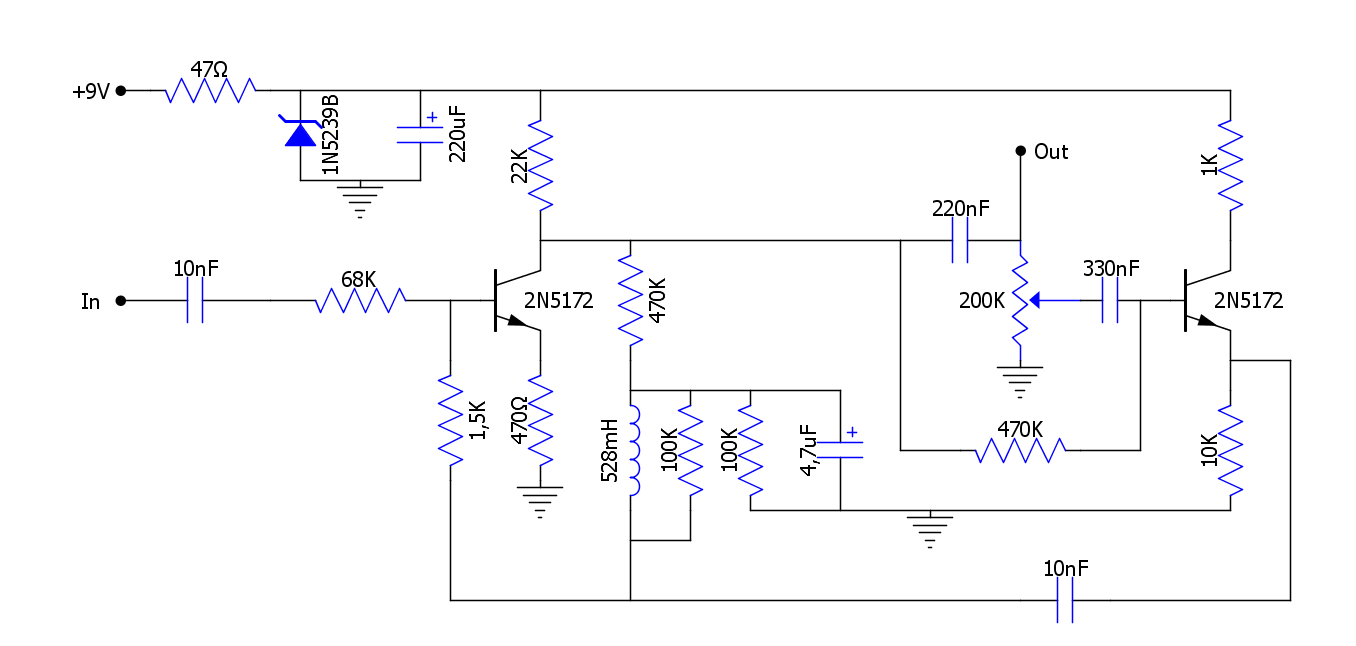 Si os fijáis bien, veréis que la entrada al circuito no es como en la mayoría de los esquemas de wahs. En este el condensador de 10nF va primero y la resistencia de 68K va a continuación, cuando en la mayoría suele ser al revés, tal y como venía por defecto en el JH-1. Esto no tiene la más mínima importancia y no afecta al sonido del pedal. Además da la casualidad de que era precisamente así como iba en los Clyde McCoy originales pero no lo he hecho así por esto, no merece la pena, sino por otra buena razón: he querido jugar con el condensador de entrada y simplemente no disponia de sitio con la configuración que traía el JH-1 para poder poner condensadores más grandes. Ya dije antes que tengo un alijo de pececitos tropicales y entre ellos unos cuantos con valores adecuados para juguetear: