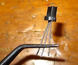El Crybaby original lleva tres transistores en total. Dos son del efecto en sí y el tercero es de un "buffer" que lleva a la entrada. Este buffer fué eliminado según las instrucciones de la web de Andreas Möller (o de Stuart Castledine, que es más o menos lo mismo). De este modo no sólo lo dejamos más acorde con el esquema original sino que de paso eliminamos algo de ruido inducido por dicho buffer. El transistor en cuestión es un "Darlington", esto es, dos transistores en cadena en un mismo chip dando un conjunto de muchísima ganancia. Se trata de un MPSA13.