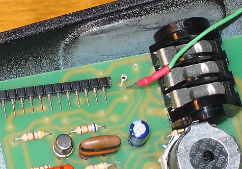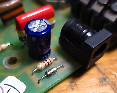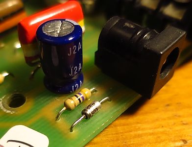 Justo al lado del jack de alimentación vemos un trío de componentes dedicados a la estabilización y filtrado de alimentación que no están en el circuito original del Clyde McCoy: