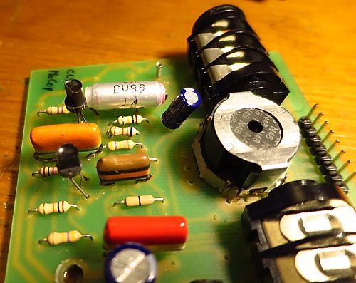 nos encontramos con que ya nos quedan tan sólo 2 transistores: una pareja de MPSA18 que son unos estupendos transistores modernos de muy bajo ruido y que se encuentran en practicamente la mayoría de los wahs modernos, tanto Dunlop como VOX pero que desgraciadamente son de muchísima más ganancia de la necesaria para un wah. Estos MPSA18 tienen una ganancia de aproximadamente unos 800 de hFE cuando los transistores originales, los BC109B tenían unas ganancias en torno a los 300 a 350 de hFE. Afortunadamente los BC109B aunque no son demasiado fáciles de conseguir aún se fabrican y esos mismos fué los que sustituí por los originales de demasiada ganancia. Recomiendo comprar varios BC109B y medirlos con un polímetro que mida transistores. Seleccionar los que estén dentro del rango antes citado y poner el de más ganancia en la primera posición y el de menos en la segunda:
