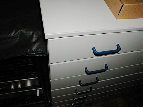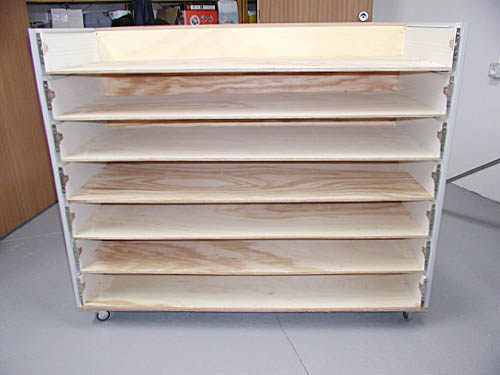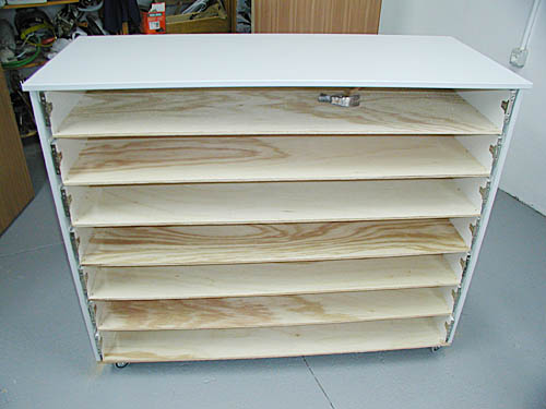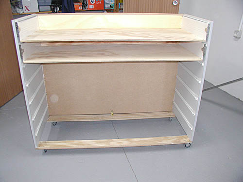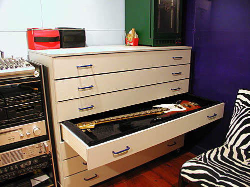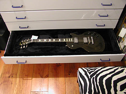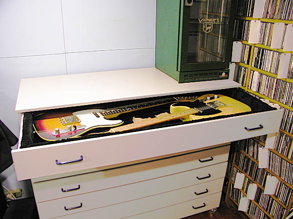 La idea se me ocurrió al ver un mueble tipo flight case a lo gande con las guitarras que Gilmour o Steve Vai (no recuerdo bien de quien era el artilugio...) llevaba en una gira. No tengo esa foto a mano, pero básicamente se trataba de una cajonera con ruedas, donde cada cajón era casi como un estuche para un instrumento.