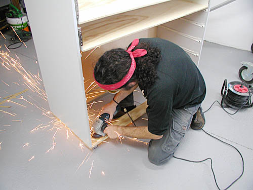 Y aquí me veis a mi cortando con la radial el sobrante de los tornillos. Olvidé comprar de la medida adecuada y usamos unos que sobresalían, así que los tuvimos que repasar.