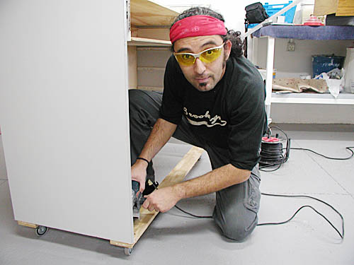 También vimos oportuno colocar unas ruedas para poder trasladarlo de un lado a otro de la habitación. Calculad el peso que puede coger cuando está lleno de guitarras, pedales y chuches varias... Elegimos unas ruedas con bloqueo, ya que el mueble cargado de guitarras es bastante pesado y de esta manera nos evitamos tener que "frenarlo en marcha"