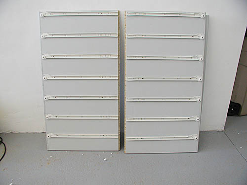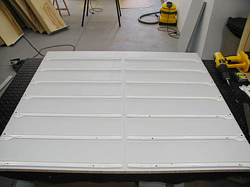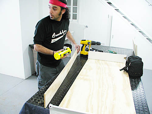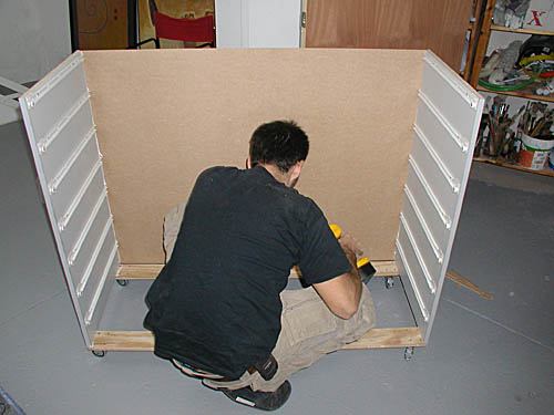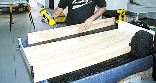 Para esto utilizamos contrachapado de 9 mm de espesor y estas dos piezas van encoladas y clavadas entre sí. A su vez van atornilladas a los perfiles laterales.