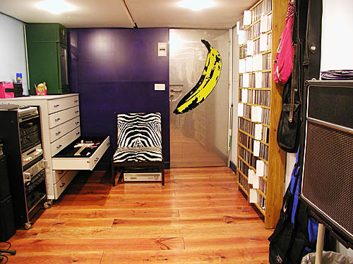 Observad como la nevera de color "verde Carlsberg" que hay encima, entra justita sin tocar en el techo, así como al abrir los cajones, estos no tropiezan con el sillón "pasodecebra", del mismo modo que la encimera nos queda casi a la misma altura que la mesa de mezclas que está en la parte superior del mueble negro que se ve con la etapa de potencia y los efectos.