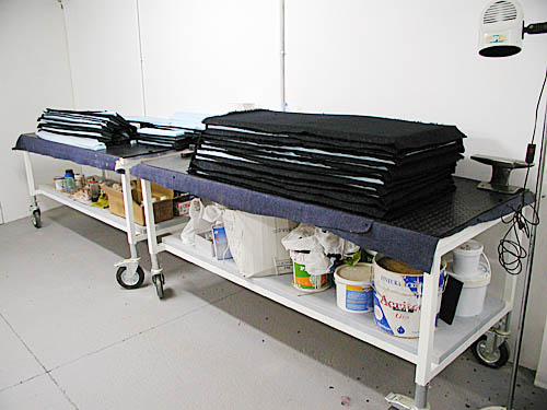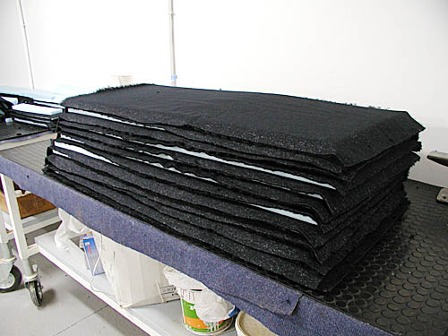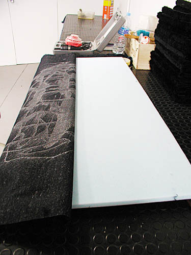 Vamos ahora con el forro de los cajones. Nuestra idea desde un principio era que las guitarras estuvieran perfectamente acomodadas como en sus estuches originales, así que necesitamos un material acolchado y suave. Como si de un estuche real se tratara, compramos espuma de poliuretano de 2 cm de espesor de la más densa que encontramos. Ese será el material acolchado que forraremos a su vez de peluche negro, como si de un estuche SKB (por ejemplo) estuviéramos hablando.
