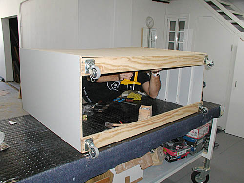 Claro está que así queda pendiente lo que será el frontal del cajón, donde irán los tiradores. Aquí veis a Dani, que mientras yo encolaba y clavaba los cajones iba montando los raíles en las paredes interiores del mueble.