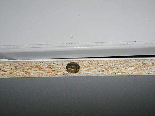 En cualquier ferretería donde compréis los tubillones os podrán proporcionar también este casquillo, que introducido en el agujero que hayamos hecho con la broca en la tabla inferior, nos permite por medio de un golpecito, marcar en la encimera el lugar exacto donde taladrar la encimera para que el tubillón caiga en el lugar preciso. La foto muestra el casquillo y la encimera en la que ya hemos marcado el lugar para taladrar.