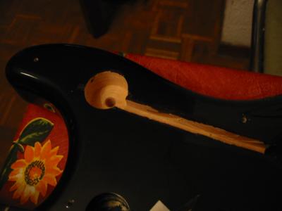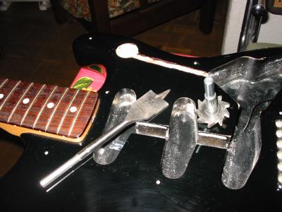 Para instalar el kill switch necesitaba un agujero en el cuerno inferior de la strato y un canal para poder pasar el cable, así que quité las cuerdas, desmonté el golpeador y dejé el cuerpo desnudo. Luego, con un taladro y unas brocas especiales (salen en la foto, la "rueda dentada" es para el canal, y la otra para el agujero) hice el agujero redondo para el switch y el canal. El agujero fue facilísimo de hacer, pero el canal ya costo un poco mas, pero al final no quedo mal: