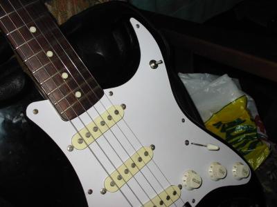 La Strato en cuestion es una Fender Stratocaster japonesa de los 80, que aunque no sea la típica Strato americana de tropecientos miles de euros, suena muy bien, estoy muy contento con ella.