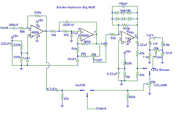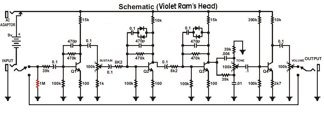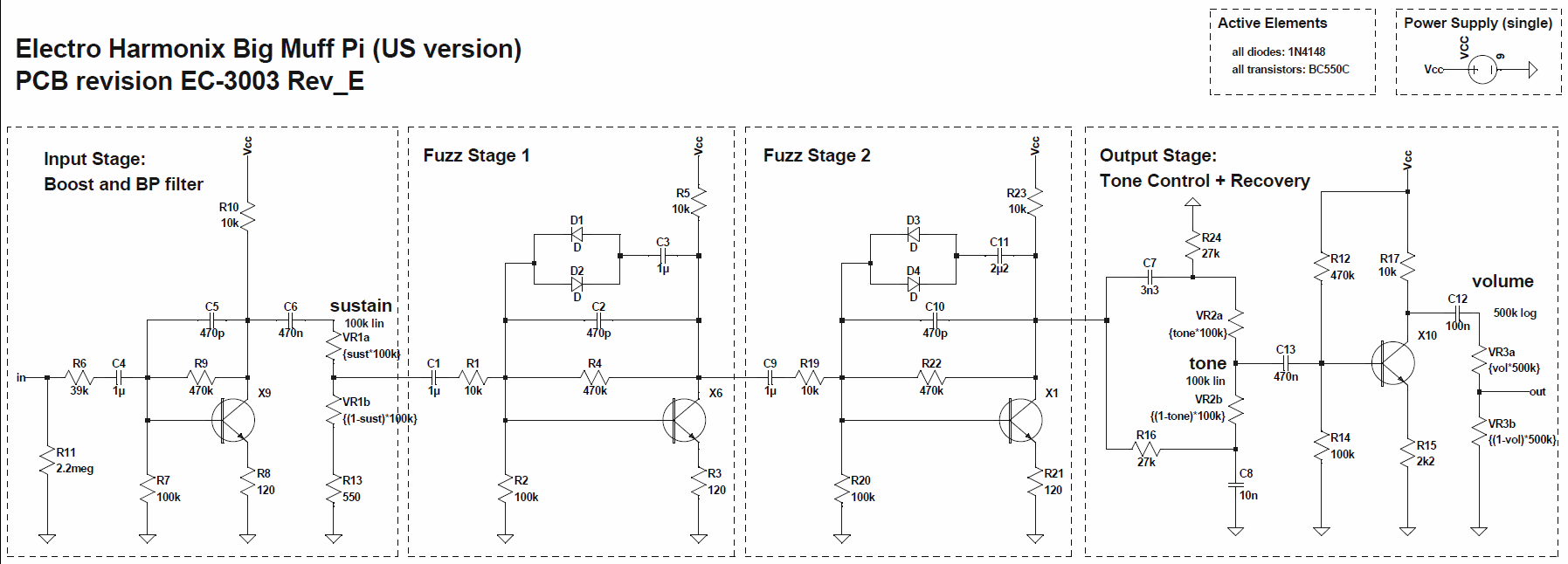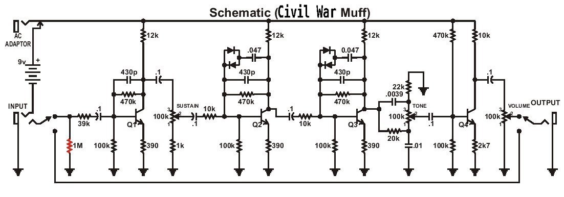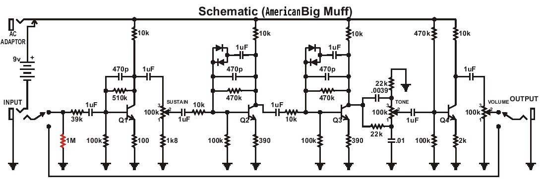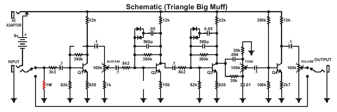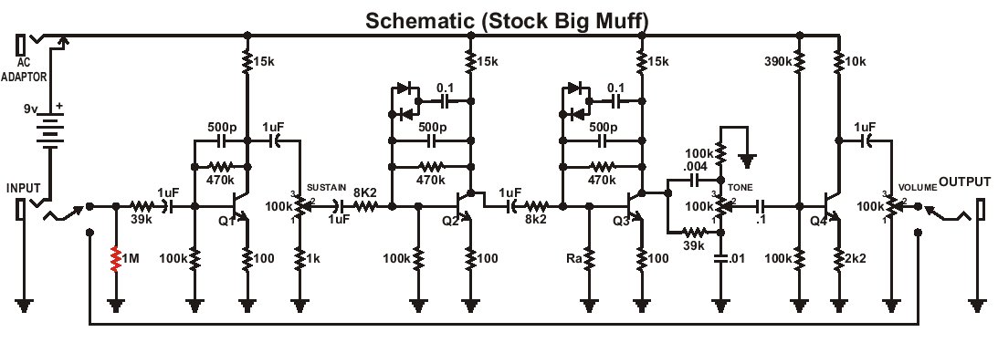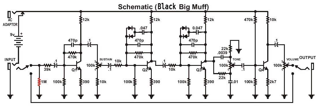 Traceado originalmente por MBC. Las diferencias con el green russian son insignificantes, simplemente 3 valores de resistencias (la que pone el minimo de sustain, que en el green es 1k y en el black 10k, que la de 20k en el tonestack pasa a ser 22k en el black, y la resistencia a tierra del ultimo transistor es de 2k7 en vez de 2k).