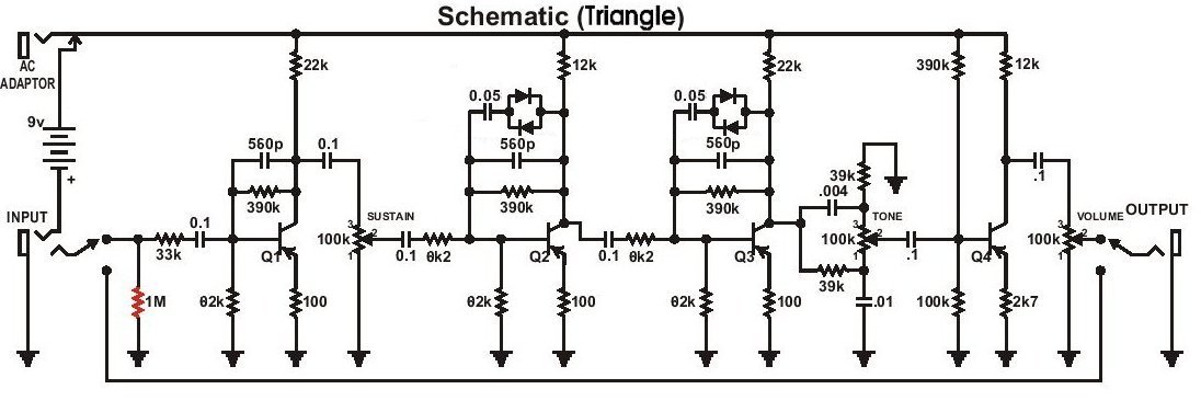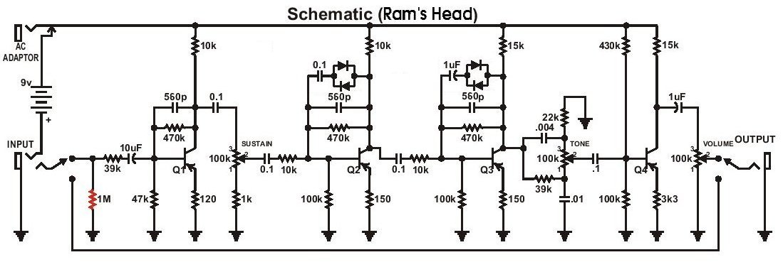 Interesante que es prácticamente el mismo circuito de la version 3 excepto que los condensadores son de 0.1 en vez de 1, lo que lo hace mas controlable en graves, y un cambio en la resistencia a tierra de la parte de Tono del circuito, siendo 39k en vez de 100k, lo que lo hace tener ligeramente menos medios (mismo tonestack que el Triangle), aunque no tan pocos como el Ram's Head.