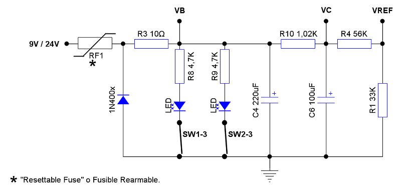 Como podéis apreciar en ambos esquemas de la etapa de alimentación, el método de conectar los LEDs es ligeramente diferente. Yo los he puesto antes del sistema de protección con el 1N5158 por facilidad de colocación en la placa que luego veremos, pero el resultado es exactamente igual pues en caso de polaridad inversa los LEDs ya son de por sí diodos y no lucirán. Eso sí, si detectáis una inversión de polaridad, desconectad rápidamente pues a los LEDs no les sienta bien tanta tensión inversa.