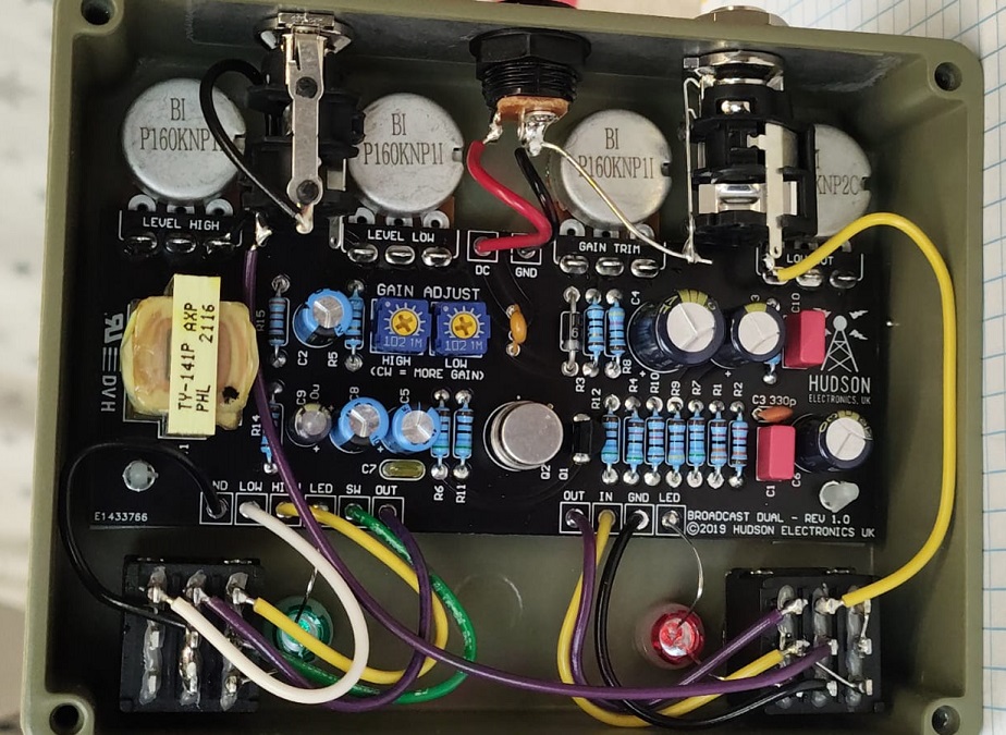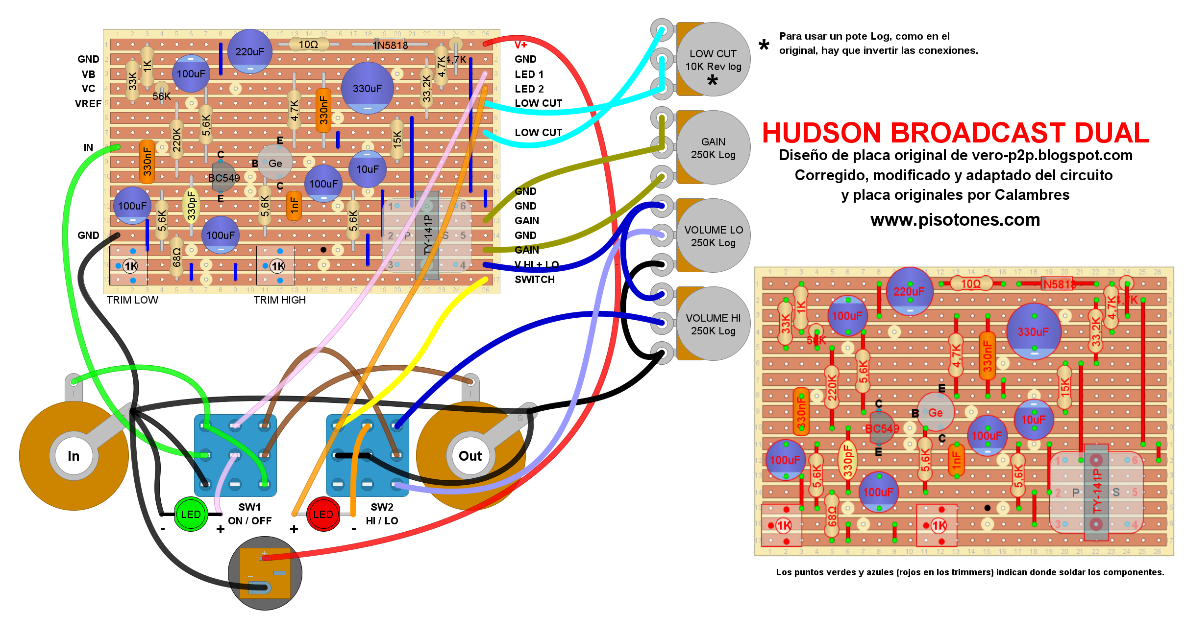 Quizás os hayáis percatado de que en el layout propuesto los colores de los LEDs van al revés que en el pedal original. Es otra licencia que me he tomado pues pienso que así es también más intuitivo. Me parece que el verde es más típico de "ON" y el rojo más de "HI" que al revés, como está en el Hudson Broadcast. En todo caso, ponedlos como queráis y del color que queráis (menos azul, por supuesto).