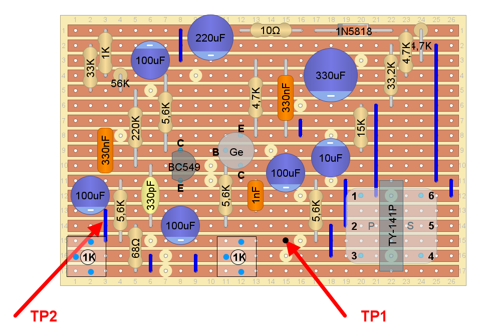 El TP2 es el puente que une el negativo de C5 (100µF) con el trimmer TRIM LOW. Quizás os hayáis fijado en que en la coordenada 15-15 hay un punto negro. Pues bien este punto indica TP1 y no es otra cosa que un hilo o un terminal que hayáis soldado ahí y que sobresalga por encima de la placa de modo que os sirva de Test Point. De este modo podréis usar el osciloscopio o el polímetro para ver qué se cuece en esos puntos. Insisto en que las nuevas placas no los llevan así que no deben ser tan importantes.