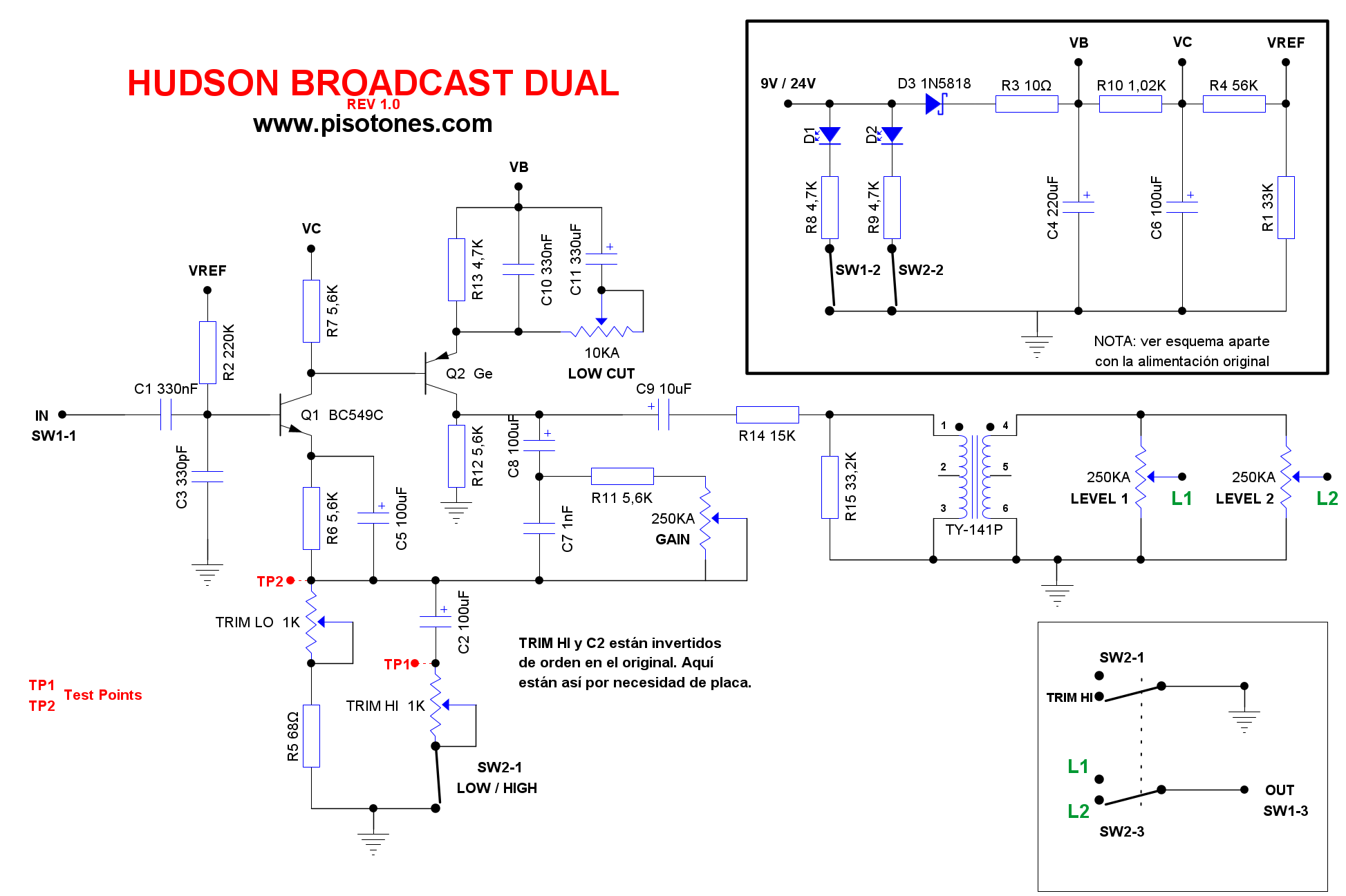 El esquema del Broadcast Dual lleva ya tiempo disponible en la web y es en el que me he basado en origen para el que véis aquí arriba. Sin embargo, si comparáis con lo que se encuentra en la web veréis que hay algunas diferencias. Unas son adaptaciones mías y que comentaré a continuación y, más importante, otras son correcciones de errores que tenían esos esquemas previos. Como he comentado he "retrazado" la placa original y he visto que hay algunas diferencias que he corregido, optando siempre por los valores reales. En cualquier caso el esquema que os he presentado es el del pedal original excepto el recuadro de alimentación que, tal y como se indica, es diferente pero equivalente. Más adelante lo explico. Así:
