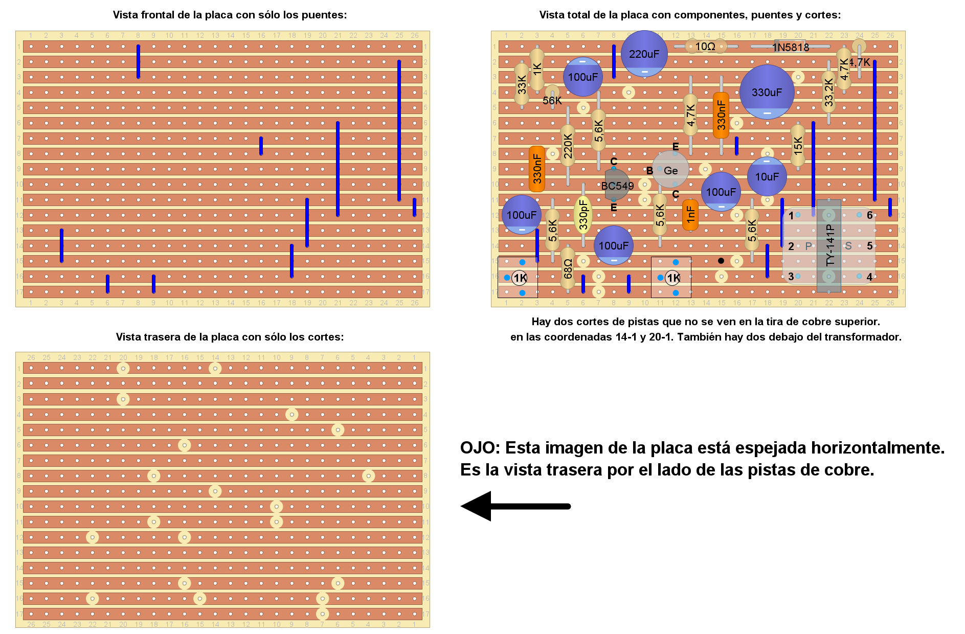 Hay que tener mucho cuidado porque en la imagen general, componentes incluidos, hay algunos cortes de pistas que quedan ocultos como los que hay debajo de la resistencia de 10Ω y el diodo 1N5818 en la tira superior o los dos que hay debajo del transformador el cual he representado de un modo un poco transparente pero cuyos cortes pueden pasar desapercibidos. Debéis guiaros por la imagen espejada de la trasera de la placa para así no cometer errores.