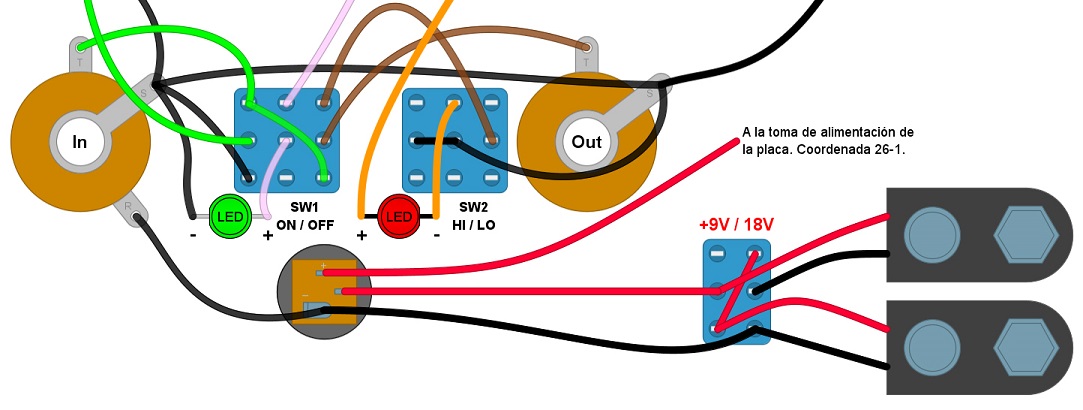Debéis tener en cuenta una cosa importante: el cableado de los switches 3PDT de pie está dibujado para que sea más claro el diagrama (layout) pero no es así como han de ir en la caja si queréis adecuaros al pedal original, cosa que recomiendo porque es lo más sensato y estándar. En la caja, según la véis en su posición de uso, el pedal de ON/OFF estará a la izquierda (LED verde) y el pedal de LO/HI estará a la derecha (LED rojo); debéis tener en cuenta que en el diagrama los switches 3PDT se ven desde "el culo" y eso implicaría que los pedales irán al revés de como se representan en el dibujo una vez metido todo dentro de la caja. Cuidado con esto. Del mismo modo debéis poner cuidado de poner el jack de IN a la derecha y el de OUT a la izquierda, preferentemente detrás. Esto evitará errores tanto de uso como de conexión.