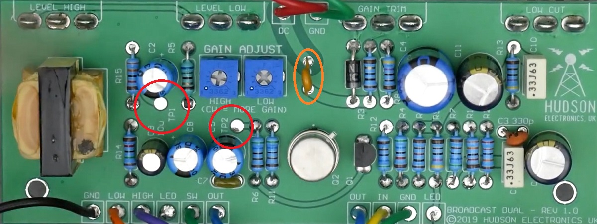 Las primeras unidades del Broadcast REV 1.0, las que llevaban la placa de color verde, tenían dos Test Point que no están en las más modernas de color negro. Esos Test Points deben servir, supongo, para ajustar fácilmente en fábrica las ganancias de los dos modos mediante los trimmers HIGH y LOW. Esos puntos aparecen en el esquema como TP1 y TP2 aunque no hay, que yo sepa, información de valores recomendados. Por si acaso más adelante lo averiguo, he decidido dejarlos indicados.