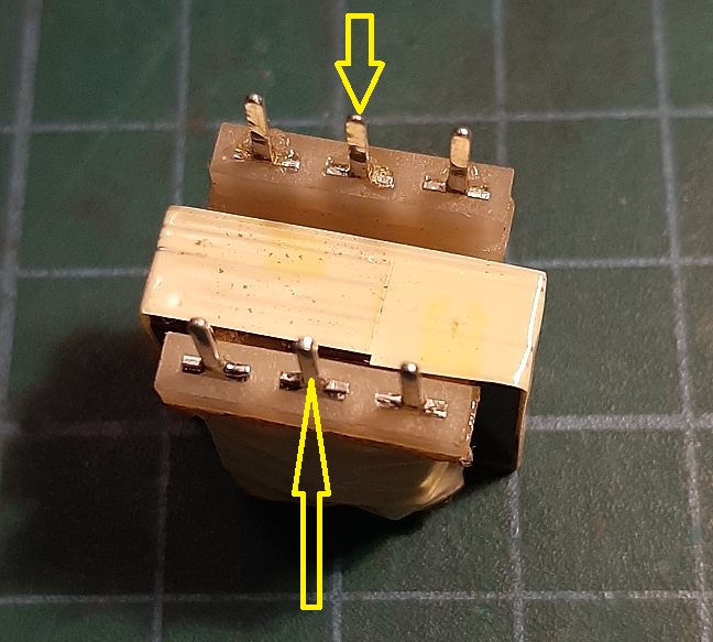 ...pero no nos confundamos, esa es la representación esquemática del transformador, no la representación de donde están puestas sus patitas físicamente. Como hemos visto, en la realidad, en "la columna de la derecha" el 4 está debajo, a la derecha del 3 y el 6 está arriba, a la derecha del 1. Hay que posicionar con cuidado el transformador y no equivocarnos.