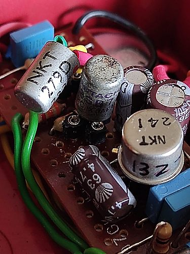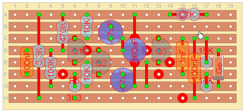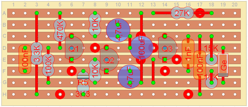 Q1 y Q2 deben ser de baja ganancia y Q3 de un poco más pero nunca de ganancias altas. En los foros especializados se citan ganancias de entre 40 y 70 de hfe para Q1 y Q2 y de entre 120 y 140 para Q3. Lo curioso del asunto, según el consenso general, es que para que este circuito en concreto funcione bien, los transistores deben de tener algo de fugas (ser "leaky"). Si no tienen fugas no irán bien en el circuito, circunstancia poco común y a la vez afortunada porque lo realmente difícil con transistores de Germanio es el que no las tengan. Yo he probado con bastantes transistores y, la verdad, con algo de fugas va mejor que sin ellas. Q1 y Q2 han de tener menos fugas y Q3, más.