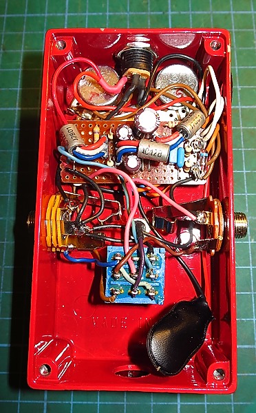 Descubrí por accidente que si se elimina R5 (la resistencia de emisor de Q2, de 3K3) se anula el segundo transistor de la pareja "semi-Darlington" que forman Q1 y Q2, esto es, Q2 deja de funcionar y sólo actúa Q1. Esto hace que el efecto se comporte de un modo mucho más "musical", si bien pierde bastante amplitud de salida y garra. El resultado es bastante curioso y muy usable, sobre todo con humbuckers. El resultado se "dulcifica" mucho y, en mi opinión, es una variante estupenda.