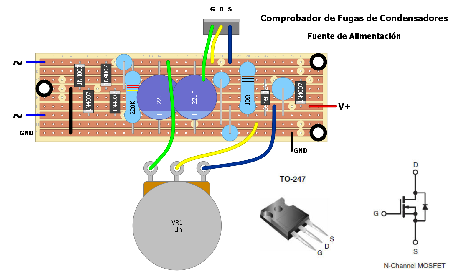 Como veis, incluyo los dos condensadores de 22uF 450V por lo que ya comenté con antelación, pero podéis sustituirlos por uno solo si es que os parece mejor y lo tenéis disponible. El FET está montado sobre el propio chasis del proyecto y por eso lleva unos cables en el dibujo y aparece fuera de la placa. No olvidéis de separar eléctricamente la aleta de refrigeración del FET del propio chasis mediante una "mica" o similar, así como el uso de silicona térmica para facilitar la transmisión de calor al chasis. Respetad la posición de los diodos y el/los electrolítico/s. Los círculos negros grandes son sólo agujeros para pasar unos separadores y así poder fijar la placa al chasis cómodamente.