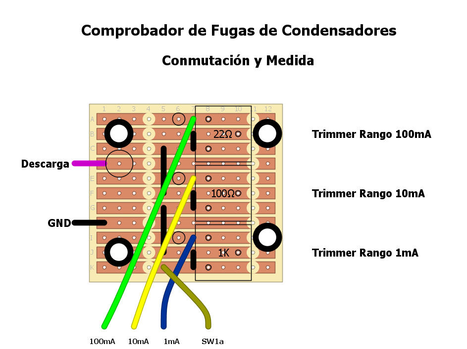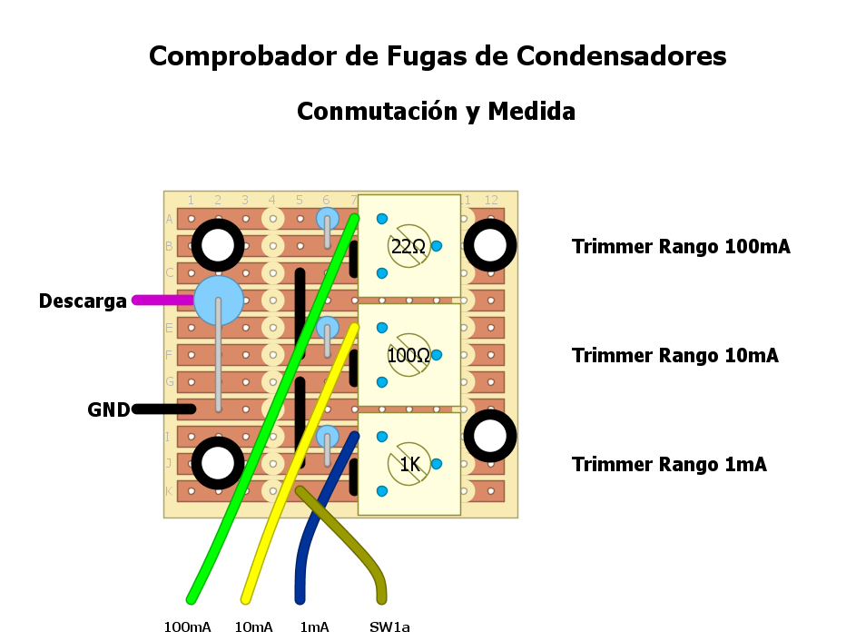 para poder cambiar a voluntad el rango del microamperímetro y hacerlo así mucho más versátil y, de paso, más robusto. De este modo según seleccionemos el conmutador obtendremos diferentes "fondos de escala". Esos potenciómetros son realmente "trimmers" para hacer una calibración inicial del microamperímetro en cada tramo y así quedar definitivamente fijados.