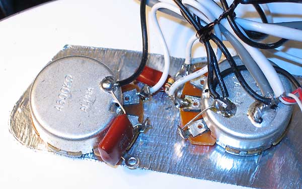 El circuito de esta reedición lleva un condensador de tono de film de 100nF y el combo "Treble bleed" consta de un condensador de 1nF en paralelo con una resistencia de 150K de 1/8W. El circuito original que vamos a poner lleva los mismos condensadores de tono pero no lleva "Treble bleed". Ojo que la configuración que trae de fábrica sólo lleva un condensador de tono pues el control es común para las dos pastillas así que si queréis hacer esto deberéis disponer de un segundo condensador de 100nF similar. Al ser los potes de volumen de sólo 100K, si queréis poner un"Treble Bleed" mejor poned sólo el condensador de 1nF o del valor que prefiráis. En mi opinión, no hace falta.