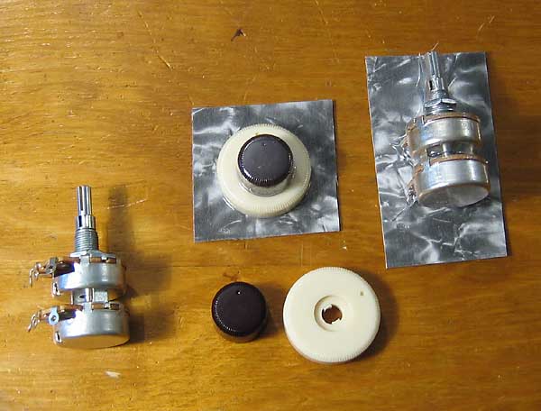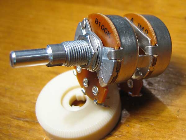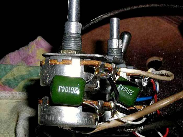 He conseguido unas fotos detalladas de los potenciómetros originales de las primeras reediciones de Danelectro, que sí llevaban el "combo" en tándem. En este caso son de una U2 pero para el caso es lo mismo pues llevaban idéntico cableado: