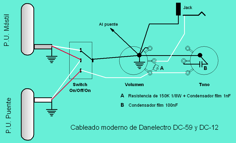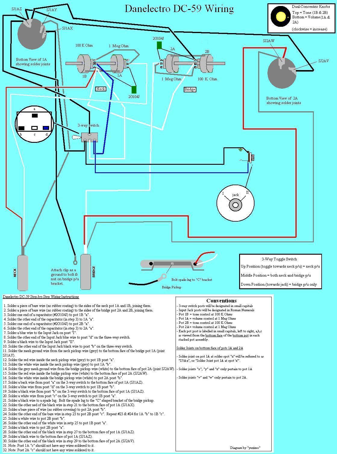 Como ya he dicho, el esquema original, de una DC-59 tanto de 6 como de 12 cuerdas, es liosísimo pero es correcto. Si queréis hacerlo debéis seguir con muchísimo cuidado el dibujo en el que afortunadamente coinciden los colores a la perfección, pero que cuesta trabajo entender. En caso de duda abajo del esquema tenéis descrito paso a paso lo que tenéis que hacer aunque esto creo que es incluso más lioso si cabe. El resultado final puede no ser del agrado de todos ya que los controles se vuelven menos precisos y es un poco más lioso de usar, aunque más versátil ya que en la posición intermedia los volúmenes funcionan como "mezcla" que controlan los volúmenes independientemente sin llegar nunca a anular el conjunto como en las Les Paul, por ejemplo. El valor de 1M de los controles de tono es demasiado alto y hace que la respuesta sea muy abrupta y si a eso le sumas el que el condensador de tono es de un valor también muy alto (100nF) el resultado final es que se nota casi sólo al final del recorrido. Casi parece un control de tono tipo "On/Off". La respuesta del control de tono mejoraría poniendo una resistencia de 1M en paralelo con el pote para convertirlo en uno equivalente de 500K o incluso de menos para rebajar el valor a unos 250K más típicos de singles y además poner un condensador más estándar de unos 22nF ó 47nF. Sin embargo pienso que esto haría que cambiase el timbre de la guitarra. En todo caso, probar esto es barato y no hace daño.
