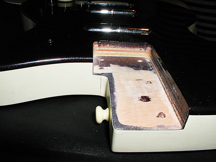 La primera sorpresa fué la perfecta unión de mástil-"pocket". Encajaban perfectamente de modo que había que tirar un poco para que saliese de su alojamiento. Acoplamiento per-fec-to... cosas del CNC, supongo. Aquí tenéis una foto del "pocket" donde se aprecia la curiosa construcción del cuerpo de esta guitarra: