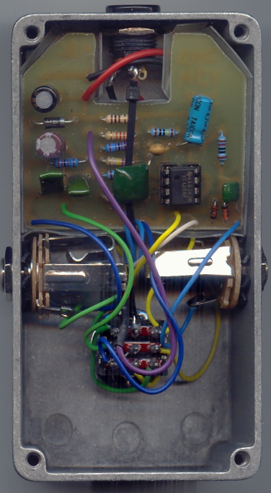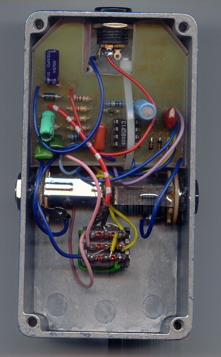 Le he añadido el led, el diodo de protección y el condensador de filtro, como siempre. Para el True Bypass he utilizado un conmutador 3PDT de los pequeños (que vengo utilizando habitualmente porque son excelentes) Como en mis anteriores proyectos, he dejado espacio para la pila (aunque en la unidad que he montando para este artículo no he instalado el clip), pero, como he comentado muchas veces, yo uso alimentador. Me he planteado alguna vez mecanizar la tapa inferior de las cajas para poder acceder a la pila sin dejar al descubierto todo el aparato, pero el asunto presenta serios problemas prácticos, así que he desistido. En todo caso, siempre podemos recurrir a soldar el clip de la pila a un jack de alimentación y enchufarlo en la toma de alimentación exterior. Yo tengo alguno montado así para hacer pruebas en el banco de trabajo sin necesidad de conectar el alimentador.